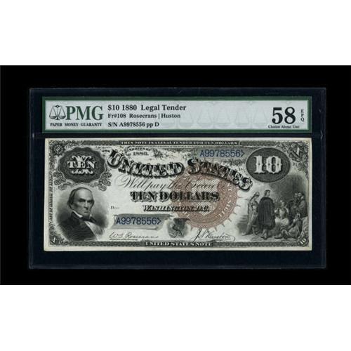 <B>Fr. 108 $10 1880 Legal Tender PMG Choice About Unc 58 EPQ.</B></I> This is a nice, original brown seal Jackass that just misses being Choice New.<BR><BR><b>Shipping:</b> Coins & Currency (<a target="_blank" href="http://www.heritageauctions.com/common/shipping.php">view shipping information</a>)