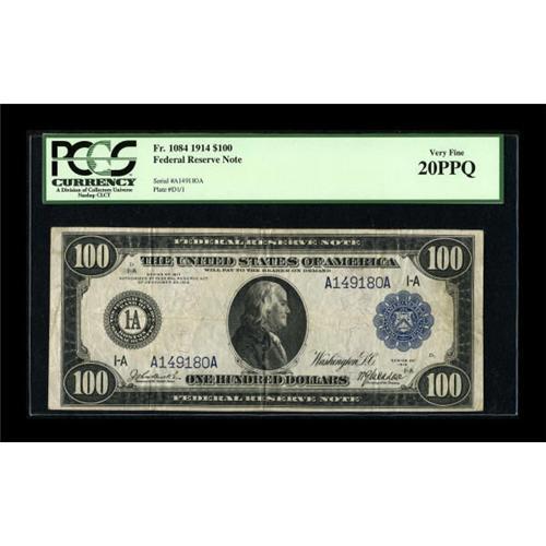 <B>Fr. 1084 $100 1914 Federal Reserve Note PCGS Very Fine 20PPQ.</B></I> Fewer than twenty examples are known of this Boston issue. The inks are dark and the note has great eye appeal.<BR><BR><b>Shipping:</b> Coins & Currency (<a target="_blank" href="http://www.heritageauctions.com/common/shipping.php">view shipping information</a>)