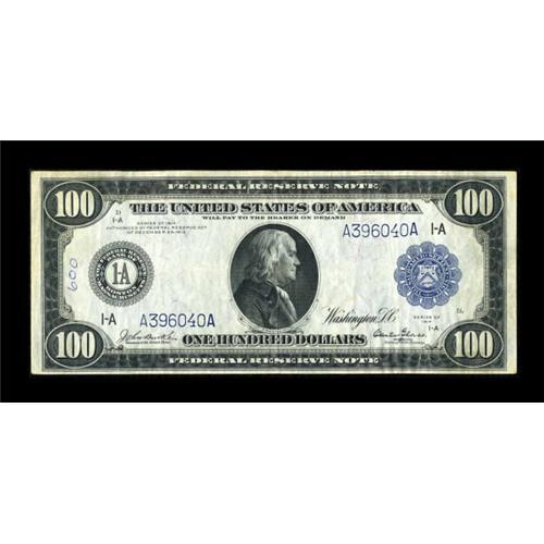 <B>Fr. 1085 $100 1914 Federal Reserve Note Very Fine.</B></I> A relatively scarce number with just 20 pieces listed in the Track & Price census. This natural note would be a perfect VF save for the penned "600" to the left of the district seal--not terribly distracting, and a lovely note otherwise.<BR><BR><b>Shipping:</b> Coins & Currency (<a target="_blank" href="http://www.heritageauctions.com/common/shipping.php">view shipping information</a>)