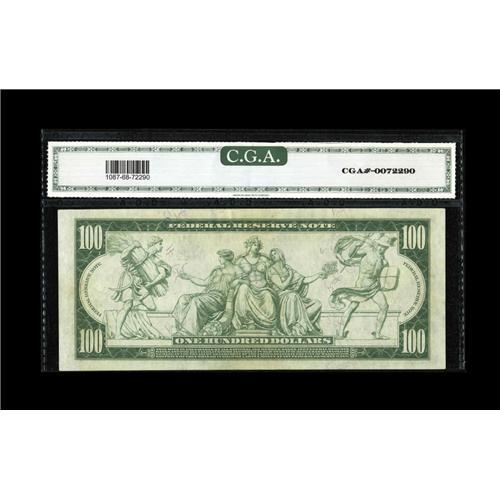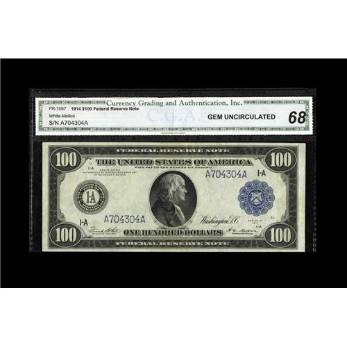 <B>Fr. 1087 $100 1914 Federal Reserve Note CGA Gem Uncirculated 68.</B></I> Only ten examples of this number are listed in the census and the only one even vaguely high grade is listed as XF-AU. We seldom get the opportunity to offer notes that are both genuinely rare by actual count and grade rarities at the same time. A $100 Blue Seal Fed in 68 would be a very rare item for even the most common Friedberg numbers, but for the only known uncirculated example of a number with a total census of under a dozen to have also earned the 68 grade is truly remarkable.