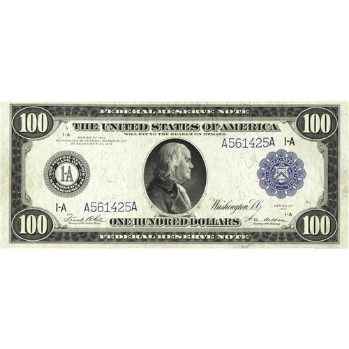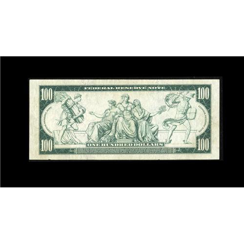 <B>Fr. 1087 $100 1914 Federal Reserve Note Choice About New-New.</B></I> This is one of now 15 examples of this Friedberg number. The surfaces of this note are natural with some light handling visible that has caused an ever so slight bend through the seal. One of those notes sure to achieve a stronger bid based on the overall eye appeal and quality.