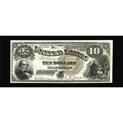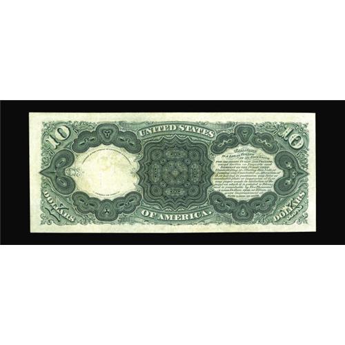 <B>Fr. 109 $10 1880 Legal Tender Very Fine-Extremely Fine.</B></I> One of the classic rarities of the U.S. paper money field. Only two Fr. 109's are known, both of which are lightly circulated. This example has been off the auction market since 1991, and the other 109 was last sold in the Memphis 1999 auction where it realized $74,800. This note is a solid VF-XF that could easily find its way into a 40 or 45 holder. It is totally free of problems, repairs or any other distraction. Most collectors will go a lifetime without the opportunity to purchase either of the Fr. 109's, but that opportunity is here now. When we sold the other Fr. 109 in November of 1992 we had not seen this piece, and were unsure which was the finest known. We have now seen both, and the answer lies with the preference of the viewer. the other note is perhaps a half grade higher, but it has a light stain and a soft spot from moisture damage. This piece is a tad lower grade, but is perfectly natural and problem free. Only two collectors can own a Fr. 109, and with the current growing interest in top rarities, we would expect to see this note easily double the 1999 record for this number.