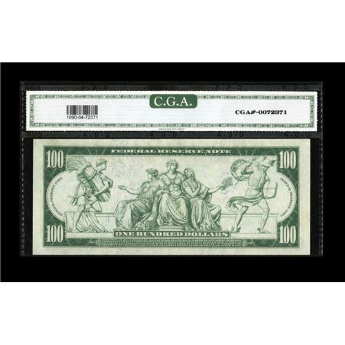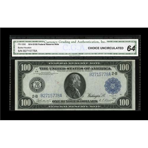 <B>Fr. 1090 $100 1914 Federal Reserve Note CGA Choice Uncirculated 64.</B></I> Bright and beautifully margined, a particularly handsome Blue Seal $100 Fed.