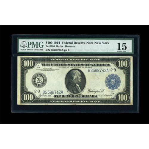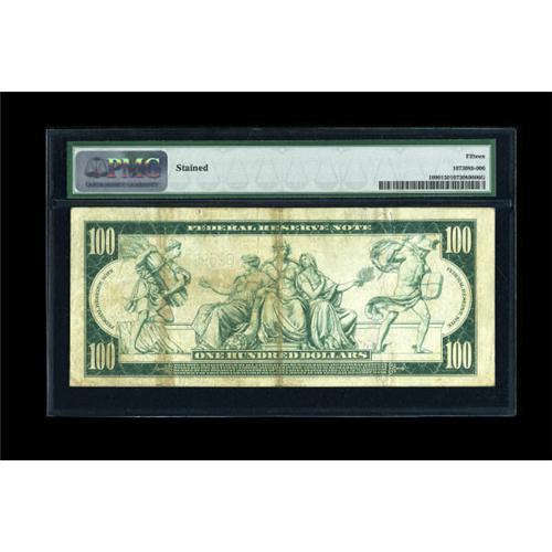 <B>Fr. 1090 $100 1914 Federal Reserve Note PMG Choice Fine 15.</B></I> The note has the full look of an XF from the face, which is clean, bright and well-margined. The back, however, shows more soil and has a light wallet stain affecting one quarter of the note. PMG has commented "Stained."<BR><BR><b>Shipping:</b> Coins & Currency (<a target="_blank" href="http://www.heritageauctions.com/common/shipping.php">view shipping information</a>)