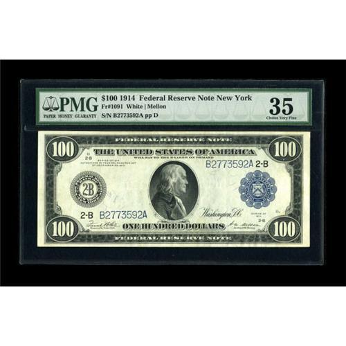 <B>Fr. 1091 $100 1914 Federal Reserve Note PMG Choice Very Fine 35.</B></I> This is a pleasing mid-grade example of this New York high denomination FRN that is blessed with huge margins.<BR><BR><b>Shipping:</b> Coins & Currency (<a target="_blank" href="http://www.heritageauctions.com/common/shipping.php">view shipping information</a>)