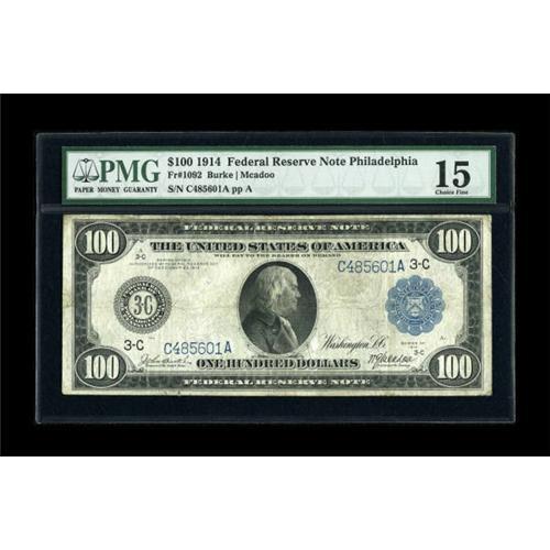 <B>Fr. 1092 $100 1914 Federal Reserve Note PMG Choice Fine 15.</B></I> A margin disturbance is noticed at lower left on this evenly circulated hundred.<BR><BR><b>Shipping:</b> Coins & Currency (<a target="_blank" href="http://www.heritageauctions.com/common/shipping.php">view shipping information</a>)