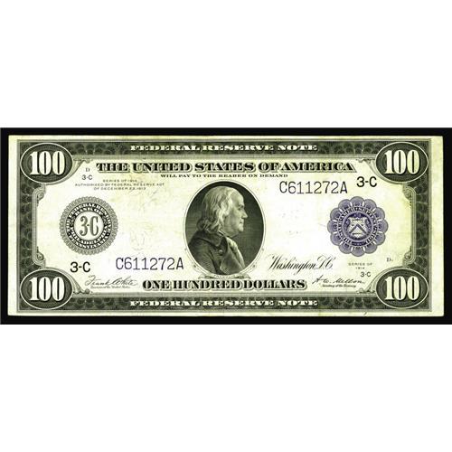 <B>Fr. 1095 $100 1914 Federal Reserve Note Very Fine.</B></I> This note is only one of three examples known in the Gengerke census. The surfaces are pleasing and the margins quite solid with no problems seen. This note last was sold by Lyn Knight in 2002. This example should see some spirited bidding as the interest for rare examples of highly collectible notes heats up.