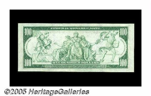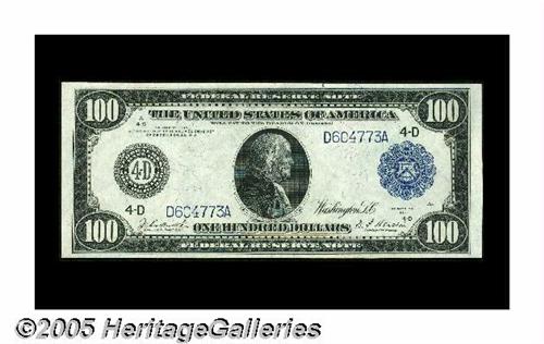<B>Fr. 1098 $100 1914 Federal Reserve Note Superb Gem New.</B></I> Fewer than twenty examples of this number are known, and if this is not the very best of them, it certainly can be no worse than tied. The margins are huge all around, the colors are absolutely perfect, and the note is flawless in every detail. Add to that deep original embossing, and you have one of the finest examples of this type that we have been privileged to sell.