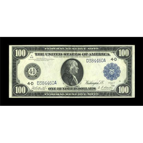 <B>Fr. 1098 $100 1914 Federal Reserve Note Extremely Fine.</B></I> This Burke-Houston issue is three light bends from a fully Gem grade. The embossing is pleasing as is the bold color of the overprint.<BR><BR><b>Shipping:</b> Coins & Currency (<a target="_blank" href="http://www.heritageauctions.com/common/shipping.php">view shipping information</a>)