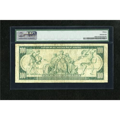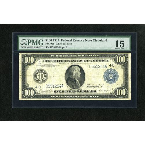 <B>Fr. 1099 $100 1914 Federal Reserve Note PMG Choice Fine 15.</B></I> Even margins are noticed on this bright example diffused by a touch of soiling.<BR><BR><b>Shipping:</b> Coins & Currency (<a target="_blank" href="http://www.heritageauctions.com/common/shipping.php">view shipping information</a>)