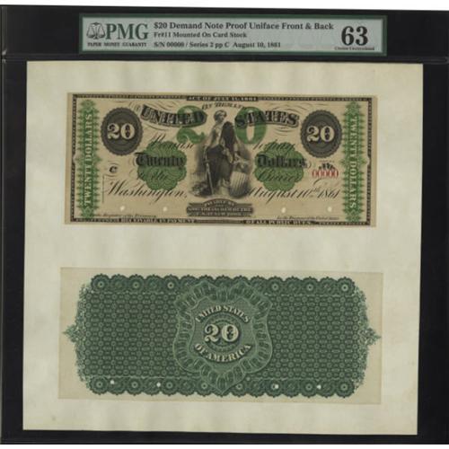 <B>Fr. 11 $20 1861 Demand Note PMG Choice Uncirculated 63. Hessler 700B.</B></I> The original Demand Notes authorized in 1861 were designed and sent to press with "For The" missing from the signature lines. They were thus handwritten on all issues until new plates were engraved in August of 1861. The uniface proof pair here was printed from plates prepared that month and reflect the small engraving change. Plate C is noted on the face and both pieces are mounted on card stock. Both the notes and the card stock remain bright and unfettered by age. Solid serial number 00000 is used and there are four hole cancels. Regular issue $20 Demand Notes are extremely scarce, with only one handwritten "for the" known. While the Friedberg reference would lead one to believe that the New York, Philadelphia, and Boston issues are attainable, they are anything but. Mid-grade notes command near six-figures, with the last piece offered over a year ago.<BR><BR><B>Coin Engraver:</B> probably Joseph Wright<BR><BR><b>Shipping:</b> Coins & Currency (<a target="_blank" href="http://www.heritageauctions.com/common/shipping.php">view shipping information</a>)