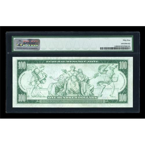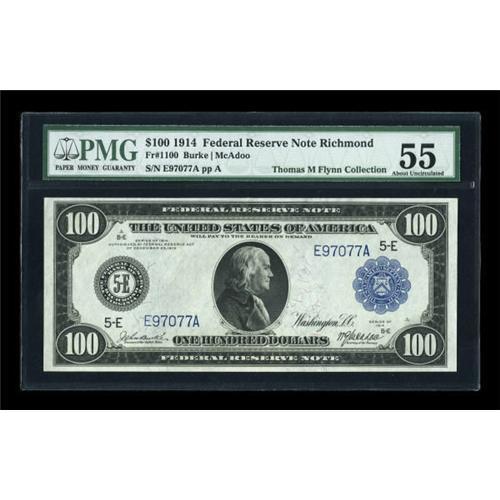 <B>Fr. 1100 $100 1914 Federal Reserve Note PMG About Uncirculated 55.</B></I> A great-looking note with the full visual appeal of a perfect Gem. We were surprised to see the census for this Burke-McAdoo Fifty as high as it is, with 43 examples known. Several of them are high-grade pieces, but no third-party-graded note above the level of the PMG 25 that we sold in 2007 has yet auctioned.<BR><I>From The Thomas M. Flynn Collection</B></I><BR><BR><b>Shipping:</b> Coins & Currency (<a target="_blank" href="http://www.heritageauctions.com/common/shipping.php">view shipping information</a>)