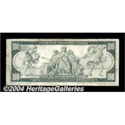 Fr. 1101 $100 1914 Federal Reserve Note Choice Fine. A major rarity, with only seven notes in the complete census. This is the fourth example that CAA has handled. It's a perfectly natural problem-free example with broad margins and surprisingly good color for the grade. The note has considerable claim to the full VF grade. <BR><BR><B>Important notice:</B> Heritage usually auctions material at the rate of 200-250 lots per hour. On some occasions eBay Live bid software or the Internet may not be able to keep up with the pace of the auction. We recommend placing a realistic absentee bid now as insurance to avoid disappointment. Occasionally the auctioneer may eliminate or reject an eBay Live bid, and the auctioneer may also reopen a lot after the close of the eBay live bidding (usually because we missed an audience bid), and may reject your bid even if it shows you as the winning bidder. By bidding via eBay Live, you agree that Heritage may award the lot to another bidder at its sole discretion under the circumstances described above or any other reasonable circumstances. Since eBay bids are not shown to us until we open the lot on the floor, we treat those bids just like floor bids. In most cases the floor responds before the eBay bid is presented to us, due to Internet lag time, so for consistency we have made it a policy that floor bids are always considered first over tie eBay live bids. Also please note that all Heritage lots purchased through eBay Live carry a 20% Buyer's Premium. Please make sure you read the Terms and Conditions before you bid. <BR><BR><B>IMPORTANT ANNOUNCEMENT ABOUT RESERVES:</B> Heritage now divulges all reserves on its web site 7 days before every auction. If you want to know whether the reserve on this lot has been met, and if not, what the reserve amount is, please visit this lot page on the HeritageCoin.com web site, or email: bid@HeritageGalleries.com