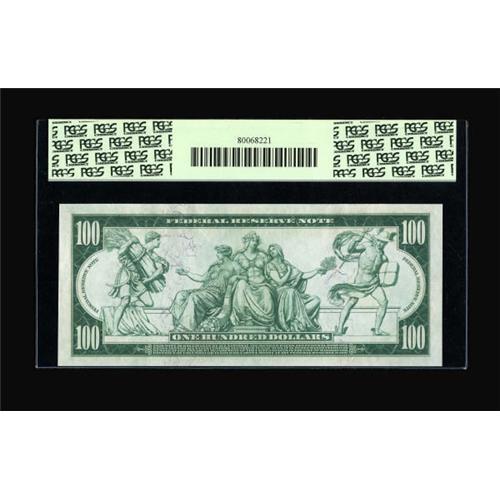 <B>Fr. 1104 $100 1914 Federal Reserve Note PCGS Superb Gem New 68PPQ.</B></I> PCGS has not released their population figures at this time, so we are left with the PMG census. While not guaranteed to be identical, the numbers will certainly be in proportion. PMG has graded sixty-four Fr. 1104s--a dozen at the 65 level, more still at 66, but only two 67s, and not a single 68. Fr. 1104 does come very nice, which accounts for the twenty plus PMG 66s, but 68s are a different animal. We doubt that there will be a half dozen at this grade level, for both services combined, ten years down the road. Whatever the total may be in the future, this incredible piece is available now. If you are interested in ultimately high-end type notes, don't let this beauty escape.<BR><BR><b>Shipping:</b> Coins & Currency (<a target="_blank" href="http://www.heritageauctions.com/common/shipping.php">view shipping information</a>)