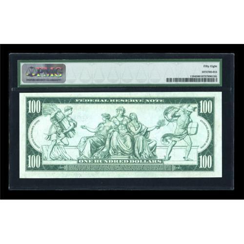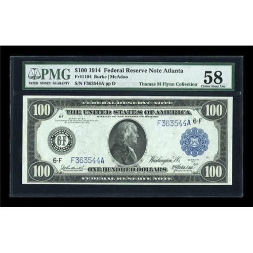 <B>Fr. 1104 $100 1914 Federal Reserve Note PMG Choice About Unc 58.</B></I> This is one of the most common Blue Seal Hundreds, with a long run of uncirculated pieces known. This solid AU - with the look of a perfect Gem - is likely to prove to be an inexpensive, yet beautiful, representation of the type.<BR><I>From The Thomas M. Flynn Collection</B></I><BR><BR><b>Shipping:</b> Coins & Currency (<a target="_blank" href="http://www.heritageauctions.com/common/shipping.php">view shipping information</a>)