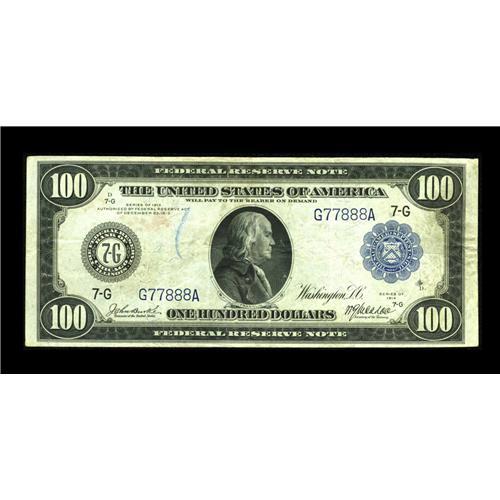 <B>Fr. 1108 $100 1914 Federal Reserve Note Fine-Very Fine.</B></I> The paper remains firm on this Chicago high denomination which is well margined. Some light marks are seen on front and back.<BR><BR><b>Shipping:</b> Coin/Currency (<a target="_blank" href="http://www.heritageauctions.com/common/shipping.php">view shipping information</a>)