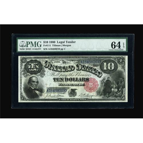<B>Fr. 111 $10 1880 Legal Tender PMG Choice Uncirculated 64 EPQ.</B></I> This beautifully fresh Jackass Ten is a note that appears to us to be right on the 64/65 line. This one could have gone either way. <BR><BR><b>Shipping:</b> Coins & Currency (<a target="_blank" href="http://www.heritageauctions.com/common/shipping.php">view shipping information</a>)