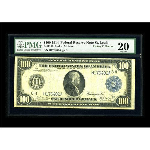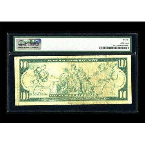 <B>Fr. 1112 $100 1914 Federal Reserve Note PMG Very Fine 20.</B></I> A very pleasing example of this very scarce number which is bright and crisp with good eye appeal and bold printing. There are also a scattering of pinholes throughout mentioned for accuracy's sake. In our 2006 FUN Sale a Very Fine with pinholes sold for $1,265 and we believe this example is strikingly similar in quality.<BR><BR><b>Shipping:</b> Coin/Currency (<a target="_blank" href="http://www.heritageauctions.com/common/shipping.php">view shipping information</a>)