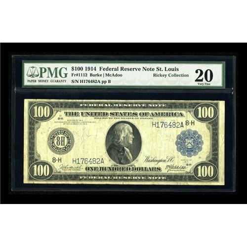 <B>Fr. 1112 $100 1914 Federal Reserve Note PMG Very Fine 20.</B></I> A very pleasing example of this very scarce number which is bright and crisp with good eye appeal and bold printing. There are also a scattering of pinholes throughout mentioned for accuracy's sake. In our 2006 FUN Sale a Very Fine with pinholes sold for $1,265 and we believe this example is strikingly similar in quality.<BR><BR><b>Shipping:</b> Coins & Currency (<a target="_blank" href="http://www.heritageauctions.com/common/shipping.php">view shipping information</a>)