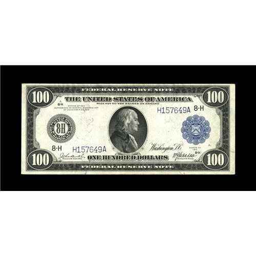 <B>Fr. 1112 $100 1914 Federal Reserve Note Very Fine-Extremely Fine.</B></I> A number of high grade examples of this issue exist, though they are considerably more expensive. This issue which faces up like a full AU represents a great opportunity to own an attractive example of the issue. The paper is solid, though a touch flat and the paper is bright.<BR><BR><b>Shipping:</b> Coin/Currency (<a target="_blank" href="http://www.heritageauctions.com/common/shipping.php">view shipping information</a>)