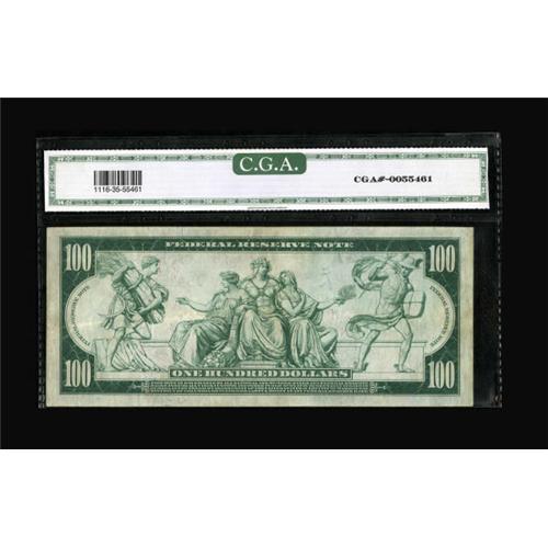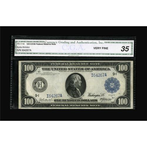 <B>Fr. 1116 $100 1914 Federal Reserve Note CGA Very Fine 35.</B></I> This popular Minneapolis district note is a better signature combination with fewer than three dozen notes known. Interestingly, the time between the notes' making auction appearances is increasing with each passing year.<BR><BR><b>Shipping:</b> Coins & Currency (<a target="_blank" href="http://www.heritageauctions.com/common/shipping.php">view shipping information</a>)
