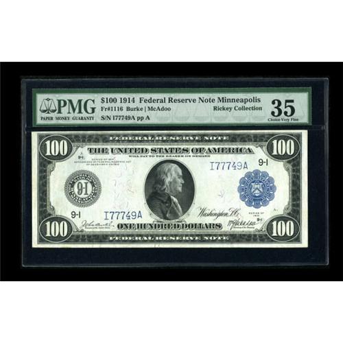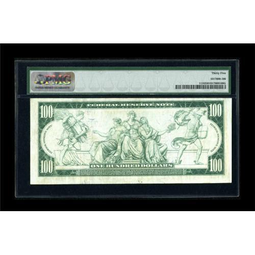 <B>Fr. 1116 $100 1914 Federal Reserve Note PMG Choice Very Fine 35.</B></I> Fewer than three dozen examples of this issue are known to exist. The overprint is a deep blue and contrasts nicely against the bright white paper.<BR><BR><b>Shipping:</b> Coins & Currency (<a target="_blank" href="http://www.heritageauctions.com/common/shipping.php">view shipping information</a>)