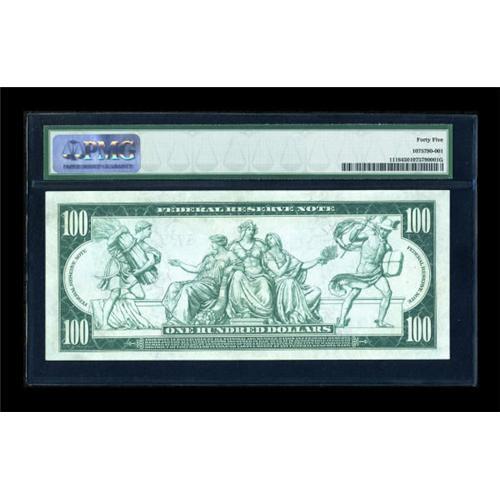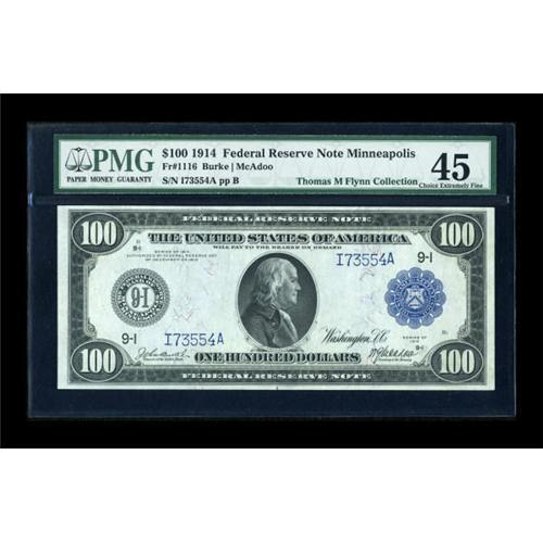 <B>Fr. 1116 $100 1914 Federal Reserve Note PMG Choice Extremely Fine 45.</B></I> Track & Price indicates 37 pieces known for this Minneapolis Blue Seal. We sold a PMG 35 this past January for $1840. This 45 has much of the look of a Choice New note with broad margins and excellent color. <BR><I>From The Thomas M. Flynn Collection</B></I><BR><BR><b>Shipping:</b> Coins & Currency (<a target="_blank" href="http://www.heritageauctions.com/common/shipping.php">view shipping information</a>)