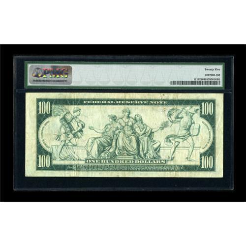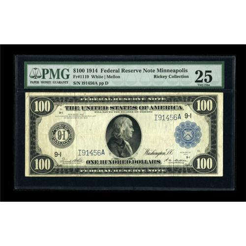 <B>Fr. 1119 $100 1914 Federal Reserve Note PMG Very Fine 25.</B></I> Nine Minneapolis White-Mellon $100s are listed in the census, with no auction appearances since 2005. This piece is solidly margined with bright paper. A few pinholes are noted, but are well hidden in the intricate design.<BR><BR><b>Shipping:</b> Coins & Currency (<a target="_blank" href="http://www.heritageauctions.com/common/shipping.php">view shipping information</a>)