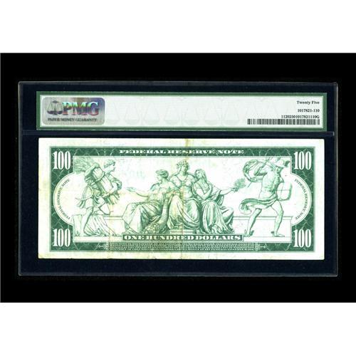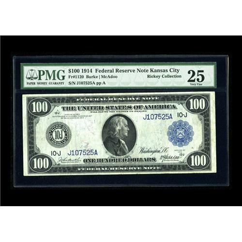 <B>Fr. 1120 $100 1914 Federal Reserve Note PMG Very Fine 25.</B></I> Ten of the existing thirty examples have never been offered for public sale, and those locked up in institutional collections will never be offered. The paper quality on this issue appears original with only a couple of pinholes worthy of mention. The seal and serial numbers remain bright blue. <BR><I>Ex: Rickey Collection</B></I><BR><BR><b>Shipping:</b> Coin/Currency (<a target="_blank" href="http://www.heritageauctions.com/common/shipping.php">view shipping information</a>)