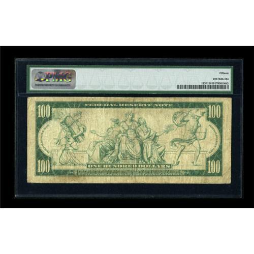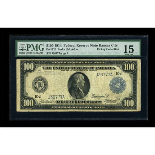<B>Fr. 1120 $100 1914 Federal Reserve Note PMG Choice Fine 15.</B></I> This five digit example is one of only about three dozen pieces known to collectors. Some pinholes are noted, but do not detract from the eye appeal of the note.<BR><BR><b>Shipping:</b> Coins & Currency (<a target="_blank" href="http://www.heritageauctions.com/common/shipping.php">view shipping information</a>)