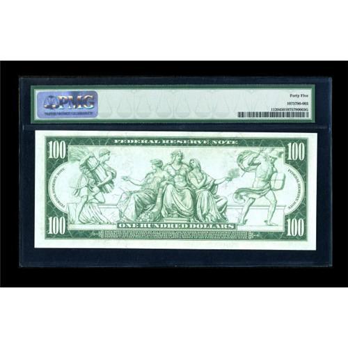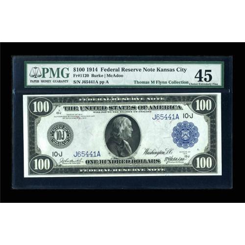 <B>Fr. 1120 $100 1914 Federal Reserve Note PMG Choice Extremely Fine 45.</B></I> There are 33 known examples of this Burke-McAdoo Kansas City Blue Seal $100. We have cut enough PMG notes out of their holders to know that as a rule, when they call a note a 45, it has several light folds, but they sure can be deceptive in the holder. This is one of those notes. This example has the full appearance of what one would expect of a Gem. No folds are visible, the margins are broad, the colors are perfect, and traces of embossing can be seen through the holder. The highest PCGS or PMG example to auction prior to this note was a PMG 30, which sold in November 2007 for $1150.<BR><I>From The Thomas M. Flynn Collection</B></I><BR><BR><b>Shipping:</b> Coins & Currency (<a target="_blank" href="http://www.heritageauctions.com/common/shipping.php">view shipping information</a>)