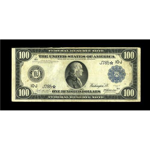 <B>Fr. 1120 $100 1914 Federal Reserve Star Note Fine-Very Fine.</B></I> This rare note is one of just 14 $100 Federal Reserve Note stars recorded for all districts combined, and one of just three extant from Kansas City. It is an attractive evenly circulated piece, and has been off the market for twenty years since its last appearance in a 1986 Hickman-Oakes sale where it was purchased by our consignor. In fact, it has been well over a decade since any Kansas City $100 star has been available at public sale. Expect to see some spirited bidding before the hammer falls on this lot, likely in the range of...<BR><I>Ex: Doug Murray.</B></I><BR><BR><b>Shipping:</b> Coin/Currency (<a target="_blank" href="http://www.heritageauctions.com/common/shipping.php">view shipping information</a>)