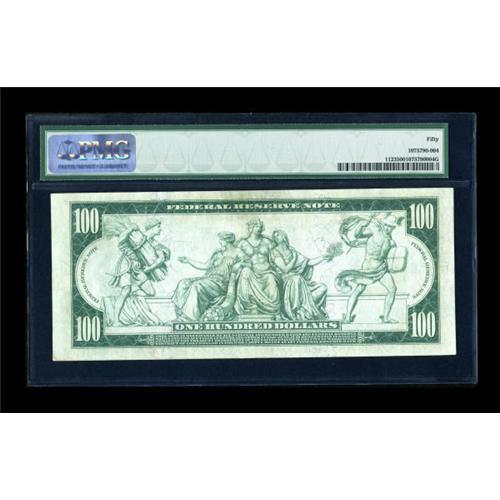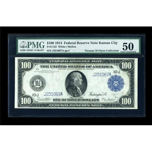 <B>Fr. 1123 $100 1914 Federal Reserve Note PMG About Uncirculated 50.</B></I> Twenty-six examples of this note are known--PMG has graded 11 of them, with this lovely AU third behind two Uncirculated pieces. The highest grade PMG or PCGS note to sell at public auction was a PMG VF 30 which realized $1150 in September 2007.<BR><I>From The Thomas M. Flynn Collection</B></I><BR><BR><b>Shipping:</b> Coins & Currency (<a target="_blank" href="http://www.heritageauctions.com/common/shipping.php">view shipping information</a>)