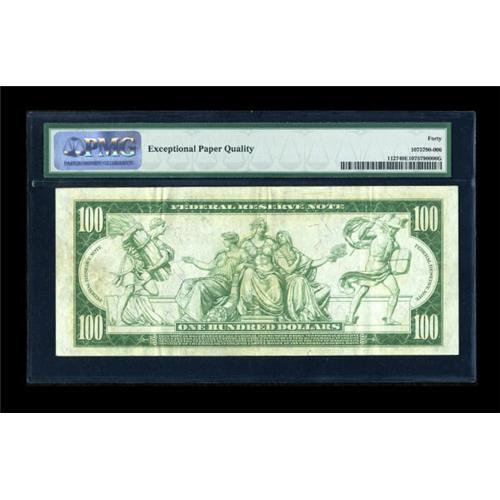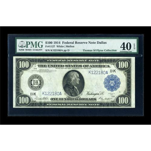<B>Fr. 1127 $100 1914 Federal Reserve Note PMG Extremely Fine 40 EPQ.</B></I> There has been no opportunity to purchase any of the five known Fr. 1127s at auction since November of 2001 when a raw VF 20 realized $3960. Tom's note is listed on the census, which remains at a significantly low five. This "Exceptional Paper Quality" PMG 40 is a gorgeous note with perfect color and pronounced original embossing. There is a single available Dallas $100 with about thirty examples known, but the total for all four numbers is less than forty. This White-Mellon piece is the highest reported in Track & Price, and the highest graded by PMG--PCGS has yet to see an 1127. This piece will very likely remain permanently at the top of the census for this truly rare number.<BR><I>From The Thomas M. Flynn Collection</B></I><BR><BR><b>Shipping:</b> Coins & Currency (<a target="_blank" href="http://www.heritageauctions.com/common/shipping.php">view shipping information</a>)