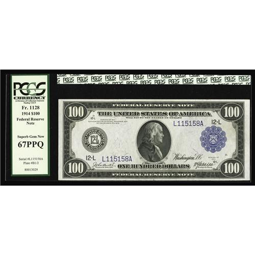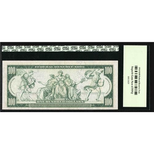 <B>Fr. 1128 $100 1914 Federal Reserve Note PCGS Superb Gem New 67PPQ.</B></I> The most common of the San Francisco Hundreds, with about 50 examples known in all grades combined. It's the twelfth that we have sold. A real beauty, with good paper originality, huge margins, bright colors and superb eye appeal.