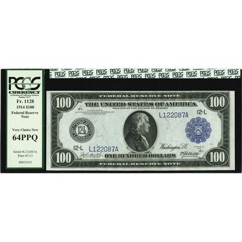 <B>Fr. 1128 $100 1914 Federal Reserve Note PCGS Very Choice New 64PPQ.</B></I> This clearly unadulterated note would have certainly warranted a Gem grade were it not for a tight top margin. With the increased popularity in large size notes and demand for quality graded notes, this piece is worth multiples of what it sold for just a few years ago, don't let it go this time around. This design is listed as No. 34 in the book <I>100 Greatest American Currency Notes.</B></I><BR><I>From The Troy Wiseman Collection</B></I>