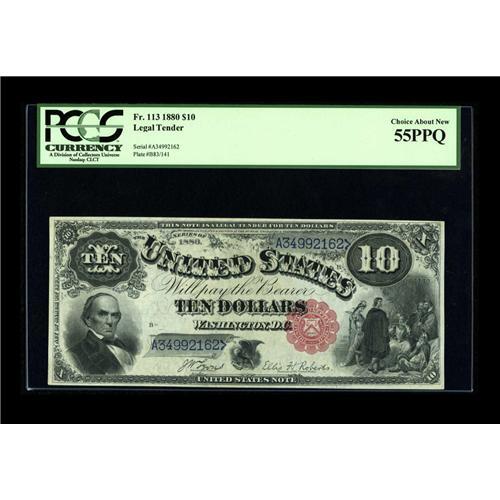 <B>Fr. 113 $10 1880 Legal Tender PCGS Choice About New 55PPQ.</B></I> Here is a lightly circulated Red Seal that exhibits plenty of punch-thru embossing. These no longer turn up with regularity in the higher grades.<BR><BR><b>Shipping:</b> Coin/Currency (<a target="_blank" href="http://www.heritageauctions.com/common/shipping.php">view shipping information</a>)
