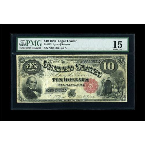 <B>Fr. 113 $10 1880 Legal Tender PMG Choice Fine 15.</B></I> This is the last Friedberg number for the popular "Jackass" design, where legend has it that a disgruntled engraver engraved the lower center eagle to resemble a head of a jackass when the note is turned upside down.<BR><BR><b>Shipping:</b> Coins & Currency (<a target="_blank" href="http://www.heritageauctions.com/common/shipping.php">view shipping information</a>)