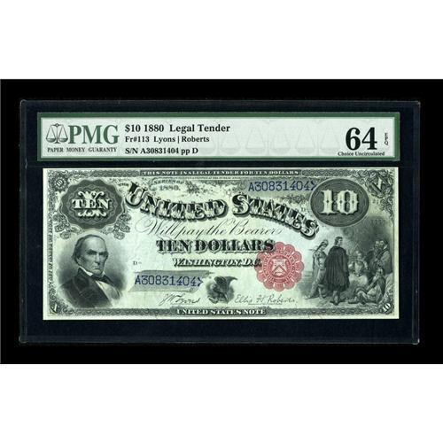 <B>Fr. 113 $10 1880 Legal Tender PMG Choice Uncirculated 64 EPQ.</B></I> Apparently, the top margin held the grade down on this otherwise Superb-appearing 1880 Ten. Pronounced paper originality is easy to see through the third party holder.<BR><BR><b>Shipping:</b> Coins & Currency (<a target="_blank" href="http://www.heritageauctions.com/common/shipping.php">view shipping information</a>)