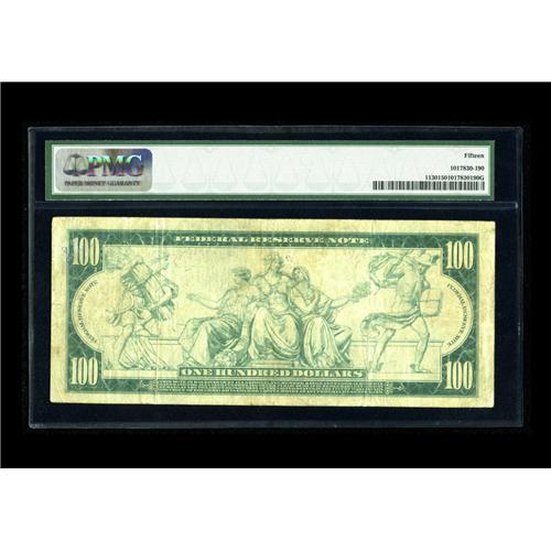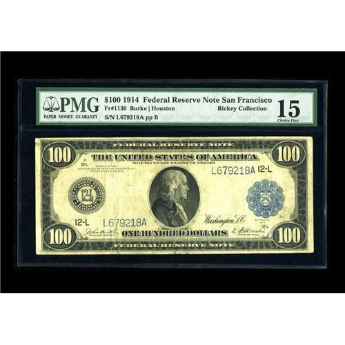 <B>Fr. 1130 $100 1914 Federal Reserve Note PMG Choice Fine 15.</B></I> According to our records, this note has never appeared at public auction, and neither have twelve of the thirty eight recorded specimens in the census. Ten pieces are permanently impounded in the Federal Reserve Bank of San Francisco. Of the issues outside of the Bank's collection, few are high grade. This piece is moderately circulated with a lone internal break that is far removed from center. <BR><I>Ex: Rickey Collection</B></I><BR><BR><b>Shipping:</b> Coin/Currency (<a target="_blank" href="http://www.heritageauctions.com/common/shipping.php">view shipping information</a>)