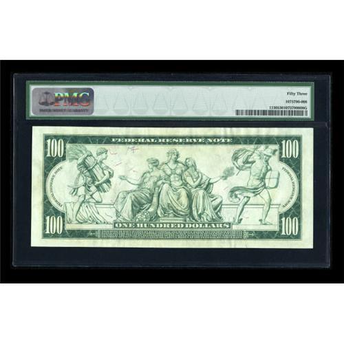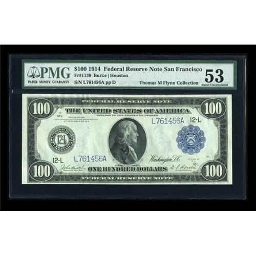 <B>Fr. 1130 $100 1914 Federal Reserve Note PMG About Uncirculated 53.</B></I> A slightly scarce piece with 51 known according to Track & Price. This will be the second highest PMG example to auction behind a 58 which sold in May 2007. In spite of the relatively high census, only three Uncirculated pieces have ever auctioned. PMG has graded sixteen examples without a single Unc, and only one AU above this 53. The note has incredible color, excellent margins, and great over-all visual appeal.<BR><I>From The Thomas M. Flynn Collection</B></I><BR><BR><b>Shipping:</b> Coins & Currency (<a target="_blank" href="http://www.heritageauctions.com/common/shipping.php">view shipping information</a>)