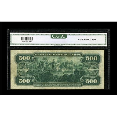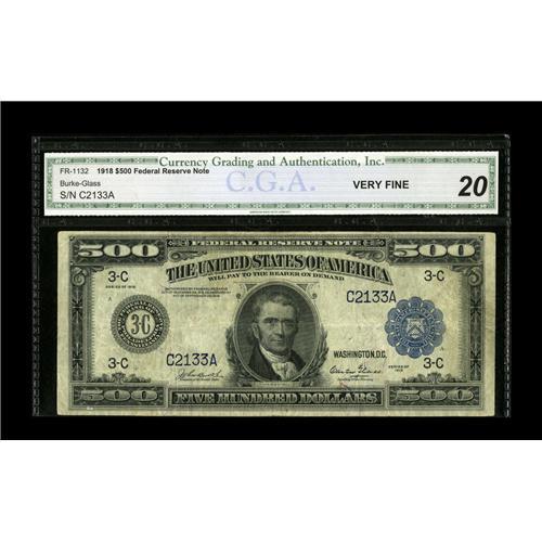 <B>Fr. 1132-C $500 1918 Federal Reserve Note CGA Very Fine 20.</B></I> This Friedberg number is represented by only three examples from Philadelphia available to collectors. Serial number one resides in the Smithsonian. A pinhole is visible in the portrait area of this pleasing note which still remains bright.<BR><BR><b>Shipping:</b> Coin/Currency (<a target="_blank" href="http://www.heritageauctions.com/common/shipping.php">view shipping information</a>)