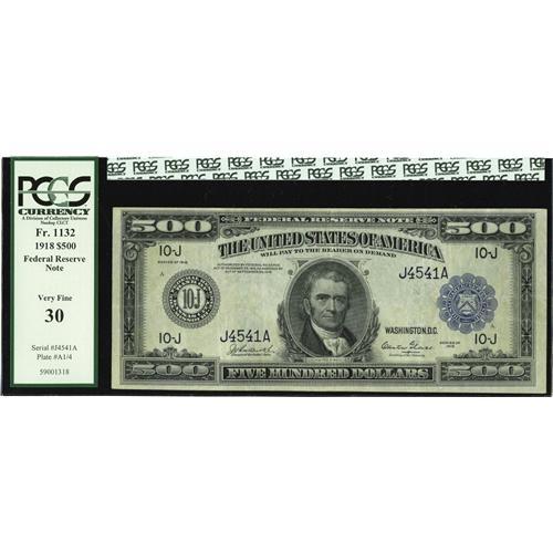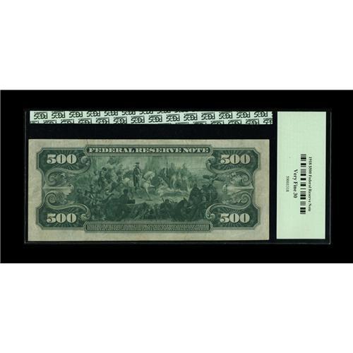 <B>Fr. 1132-J $500 1918 Federal Reserve Note PCGS Very Fine 30.</B></I> Previously we featured this note in our 2005 Central States Signature Sale where it was described, "There are only fourteen examples of this Kansas City Five Hundred known, three of which are permanently impounded in government museums. This piece is listed in Gengerke's records by serial number only, with no previous sale history. Although listed there as an EF, the note falls just short in our opinion, with the folds being both too numerous and too heavy. It's a beautiful piece, nearly totally free of soil, broadly margined and with 100% original paper surfaces, which are rarely seen on these high-denomination Feds." This design is listed as No. 89 in the book <I>100 Greatest American Currency Notes.</B></I><BR><I>From The Troy Wiseman Collection</B></I>