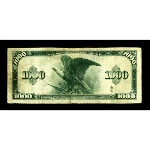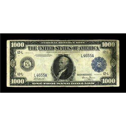 <B>Fr. 1133-L $1000 1918 Federal Reserve Note Fine.</B></I> If you are looking for a type note for this design, then this is a good candidate for you. This $1000 was probably used as vault cash for a long time. This resulted in the counting soil, the edge wear at top center, and a few characters from a teller stamp. The surfaces are also a bit soft with a spot of black ink on the back. Still an attention getting note in any collection.<BR><BR><b>Shipping:</b> Coin/Currency (<a target="_blank" href="http://www.heritageauctions.com/common/shipping.php">view shipping information</a>)