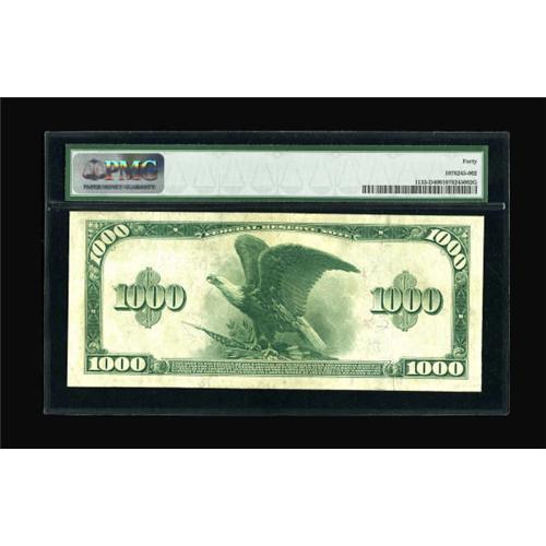 <B>Fr. 1133 $1000 1918 Federal Reserve Note PMG Extremely Fine 40.</B></I> This Cleveland District $1000 is one of just eleven examples known. There is a short run of Uncirculated pieces, but this note, which is a solid XF, is from outside of that group. A PCGS 40 realized $20,000 two years ago. This piece should do considerably better on this currently active market for high-denomination Large Size notes.<BR><I>From The John Ameen Collection</B></I><BR><BR><b>Shipping:</b> Coins & Currency (<a target="_blank" href="http://www.heritageauctions.com/common/shipping.php">view shipping information</a>)