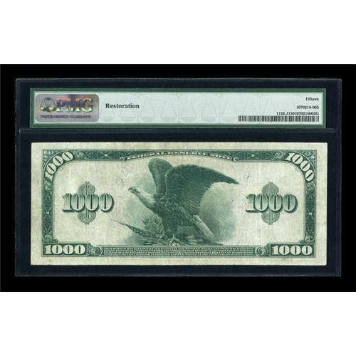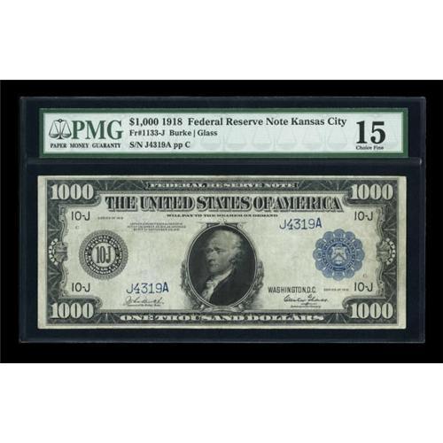 <B>Fr. 1133-J $1000 1918 Federal Reserve Note PMG Choice Fine 15.</B></I> This Kansas City District $1000 is one of only four examples known with just three available to collectors as one is held by the Federal Reserve Bank in Chicago. PMG has commented on restoration which looks to be minor as this note has great eye appeal. A wonderful opportunity for the high denomination collector.<BR><BR><b>Shipping:</b> Coins & Currency (<a target="_blank" href="http://www.heritageauctions.com/common/shipping.php">view shipping information</a>)