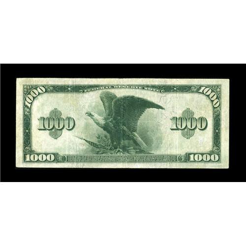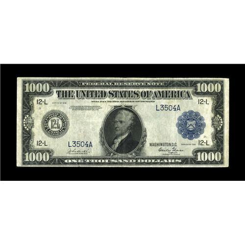 <B>Fr. 1133-L $1000 1918 Federal Reserve Note Fine+.</B></I> This is very similar in appearance to the note which sold in our September 2006 Long Beach auction for over $18,000. This note is quite bright with a few pinholes. What this example lacks in paper firmness is certainly made up for in rarity.<BR><BR><b>Shipping:</b> Coin/Currency (<a target="_blank" href="http://www.heritageauctions.com/common/shipping.php">view shipping information</a>)