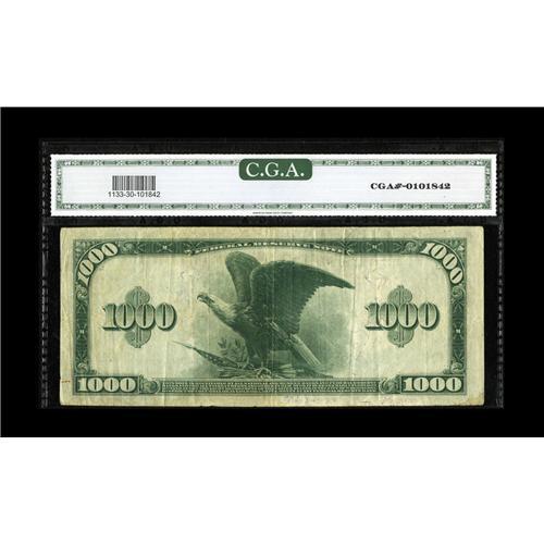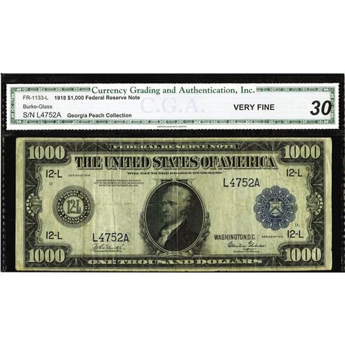 <B>Fr. 1133-L $1000 1918 Federal Reserve Note CGA Very Fine 30.</B></I> This <I>ex. Georgia Peach Collection</B></I> note faces up well within the holder and exhibits plenty of eye appeal. San Francisco is one of the more common districts though there is nothing common about Large size $1000 FRN's with a touch over 50 examples reported. Sure to generate plenty of interest in the area of...
