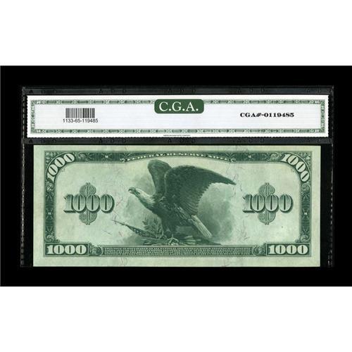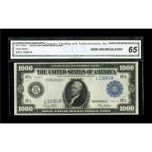 <B>Fr. 1133bL $1000 1918 Federal Reserve Note CGA Gem Uncirculated 65.</B></I> When we first offered this note in May 1993, we described it as: "Only four $1000s are known from this district with the White-Mellon signature combination, and this is the finest of them. Well centered on both sides with excellent colors, margins, and paper surfaces, this beauty is just a breath away from being Superb." The Census has not changed in the intervening years and there are still only four San Francisco Fr. 1133b's known. Those four, plus five pieces from the Atlanta District, make up the total Census for Fr. 1133b's. As with the equally rare Fr. 1133a's, the value of these notes is held down simply because it does not have its own Friedberg number. This oversight in 1953 is still being felt in today's market. Were this note a separate Friedberg number, as it certainly should be, its value would be significantly higher. This note would be a $60,000 item as a simple Fr. 1133. As the infinitely rarer White-Mellon signature combination Fr. 1133b, it should certainly double that number.<BR><BR><b>Shipping:</b> Coins & Currency (<a target="_blank" href="http://www.heritageauctions.com/common/shipping.php">view shipping information</a>)
