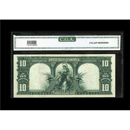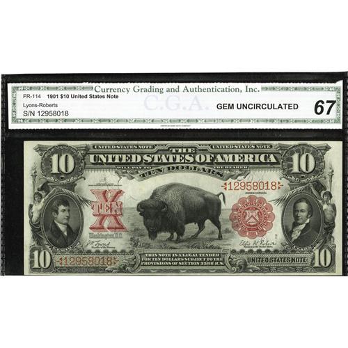 <B>Fr. 114 $10 1901 Legal Tender CGA Gem Uncirculated 67.</B></I> A gorgeous Bison, with broad, even margins, spectacular color and obvious original embossing that can be easily seen through the third-party holder.<BR><I>From The Ron W. Keeney Collection</B></I>